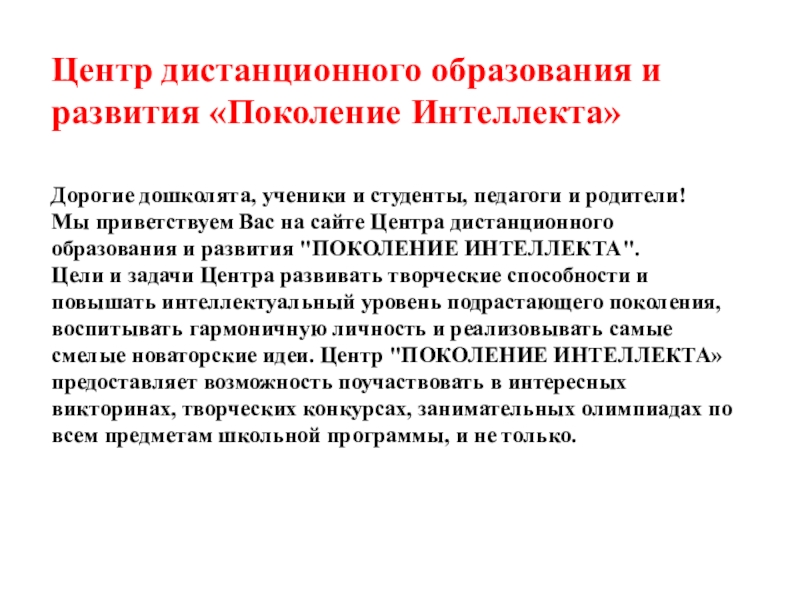 Мы приветствуем Вас на сайте Центра дистанционного образования и развития "ПОКОЛЕНИЕ ИНТЕЛЛЕКТА".