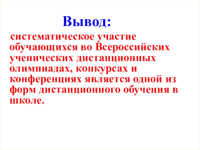 систематическое участие обучающихся во Всероссийских ученических дистанционных олимпиадах, конкурсах и конференциях является одной из форм дистанционного обучения в школе.
