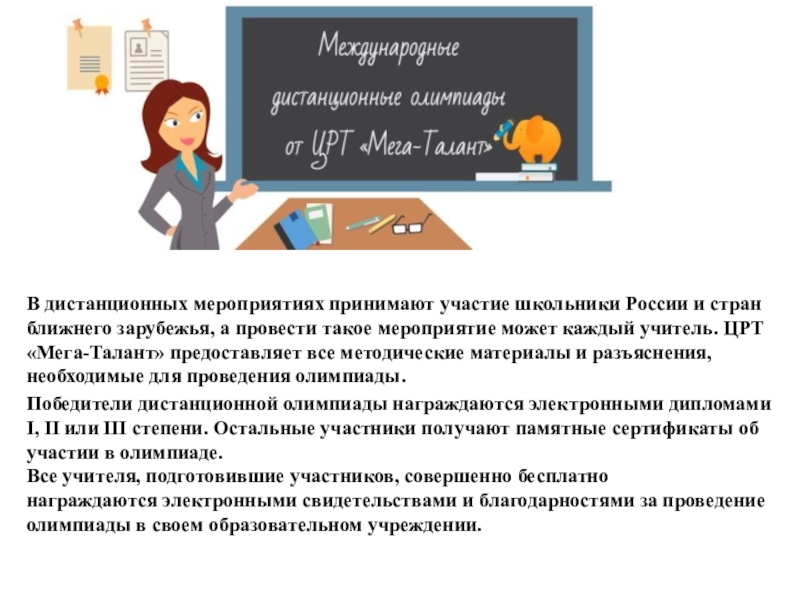 а провести такое мероприятие может каждый учитель. ЦРТ «Мега-Талант» предоставляет все методические материалы и разъяснения, необходимые для проведения олимпиады.