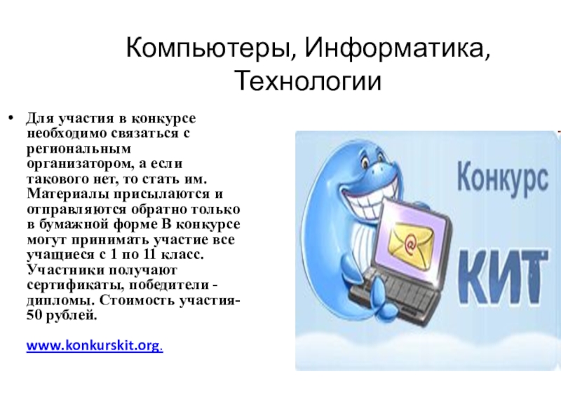 организатором, а если такового нет, то стать им. Материалы присылаются и отправляются обратно только в бумажной форме В конкурсе могут принимать участие все учащиеся с 1 по 11 класс. Участники получают сертификаты, победители - дипломы. Стоимость участия- 50 рублей.