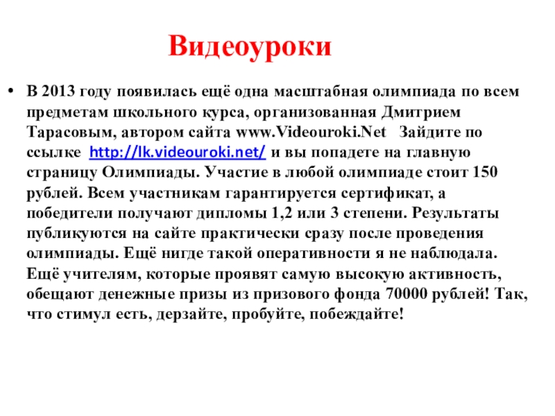 школьного курса, организованная Дмитрием Тарасовым, автором сайта www.Videouroki.Net Зайдите по ссылке http://lk.videouroki.net/ и вы попадете на главную страницу Олимпиады. Участие в любой олимпиаде стоит 150 рублей. Всем участникам гарантируется сертификат, а победители получают дипломы 1,2 или 3 степени. Результаты публикуются на сайте практически сразу после проведения олимпиады. Ещё нигде такой оперативности я не наблюдала. Ещё учителям, которые проявят самую высокую активность, обещают денежные призы из призового фонда 70000 рублей! Так, что стимул есть, дерзайте, пробуйте, побеждайте!