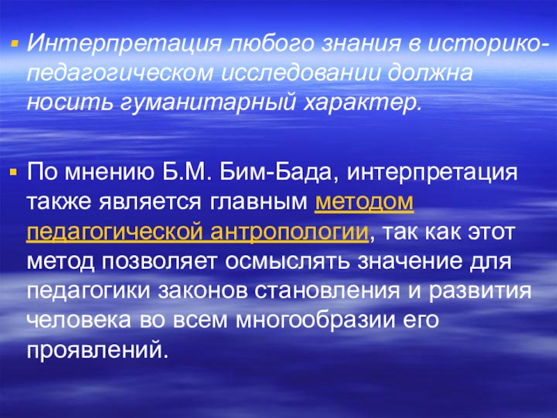 мнению Б.М. Бим-Бада, интерпретация также является главным методом педагогической антропологии, так как этот метод позволяет осмыслять значение для педагогики законов становления и развития человека во всем многообразии его проявлений.