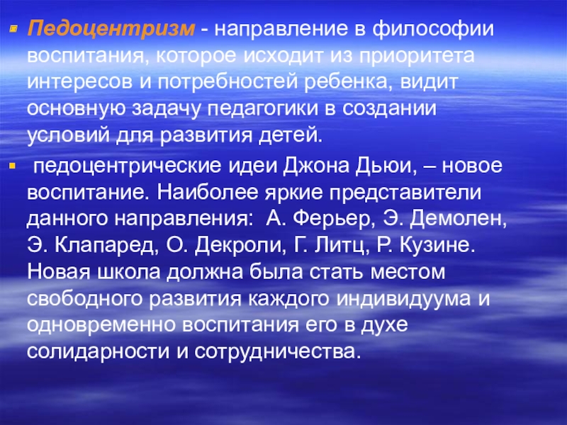 педоцентрические идеи Джона Дьюи, – новое воспитание. Наиболее яркие представители данного направления: А. Ферьер, Э. Демолен, Э. Клапаред, О. Декроли, Г. Литц, Р. Кузине. Новая школа должна была стать местом свободного развития каждого индивидуума и одновременно воспитания его в духе солидарности и сотрудничества.
