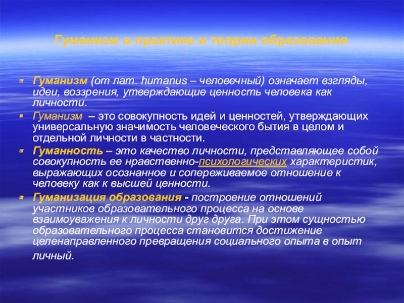 Гуманизация образования - построение отношений участников образовательного процесса на основе взаимоуважения к личности друг друга. При этом сущностью образовательного процесса становится достижение целенаправленного превращения социального опыта в опыт личный.