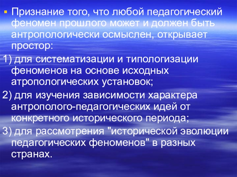 2) для изучения зависимости характера антрополого-педагогических идей от конкретного исторического периода;
