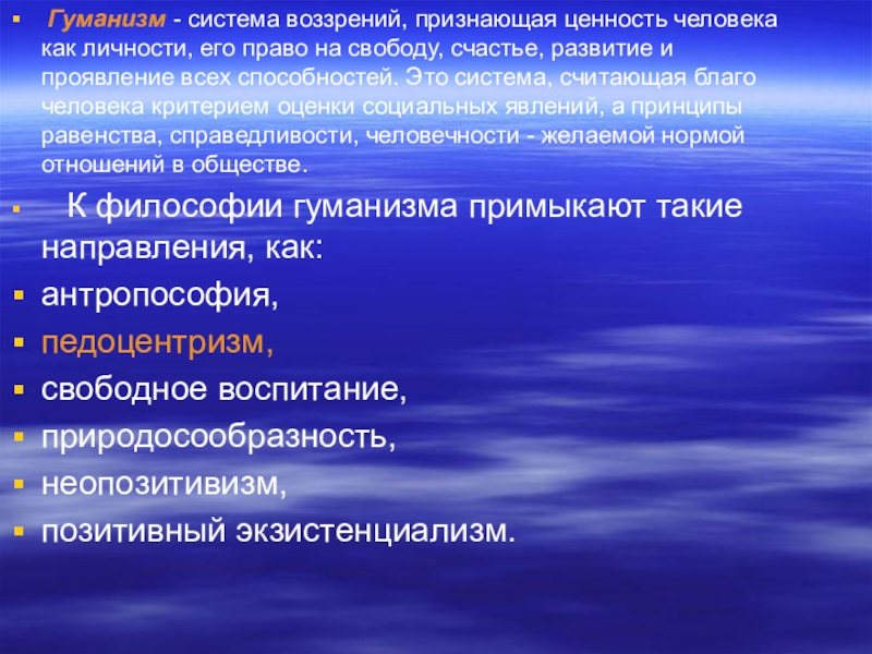 Слайд 17 Гуманизм - система воззрений, признающая ценность человека как личности, его право на