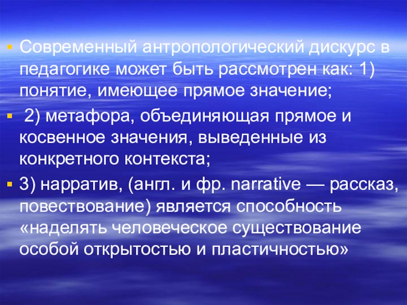 Слайд 15Современный антропологический дискурс в педагогике может быть рассмотрен как: 1) понятие,
