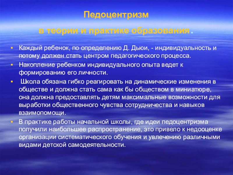 В практике работы начальной школы, где идеи педоцентризма получили наибольшее распространение, это привело к недооценке организации систематического обучения и увлечению различными видами детской самодеятельности.