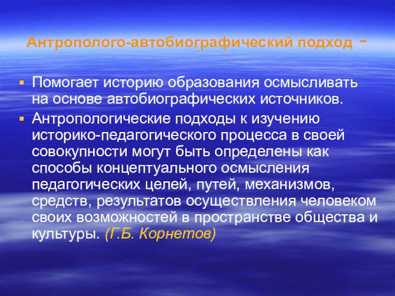 к изучению историко-педагогического процесса в своей совокупности могут быть определены как способы концептуального осмысления педагогических целей, путей, механизмов, средств, результатов осуществления человеком своих возможностей в пространстве общества и культуры. (Г.Б. Корнетов)