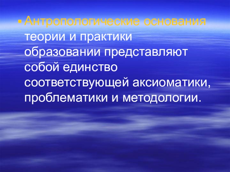 Слайд 10Антропологические основания теории и практики образовании представляют собой единство соответствующей аксиоматики,