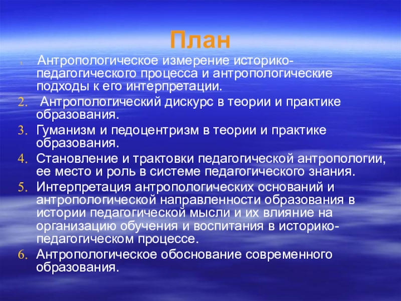Интерпретация антропологических оснований и антропологической направленности образования в истории педагогической мысли и их влияние на организацию обучения и воспитания в историко-педагогическом процессе.