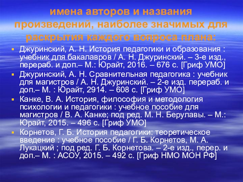 Джуринский, А. Н. История педагогики и образования : учебник для бакалавров / А. Н. Джуринский. – 3-е изд., перераб. и доп.– М.: Юрайт, 2016. – 676 с. [Гриф УМО]