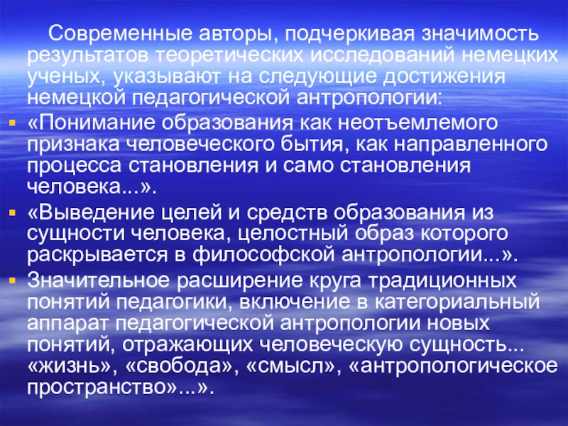 Значительное расширение круга традиционных понятий педагогики, включение в категориальный аппарат педагогической антропологии новых понятий, отражающих человеческую сущность... «жизнь», «свобода», «смысл», «антропологическое пространство»...».