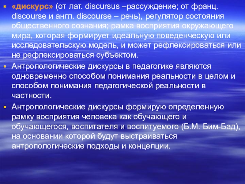 Антропологические дискурсы формирую определенную рамку восприятия человека как обучающего и обучающегося, воспитателя и воспитуемого (Б.М. Бим-Бад), на основании которой будут выстраиваться антропологические подходы и концепции.