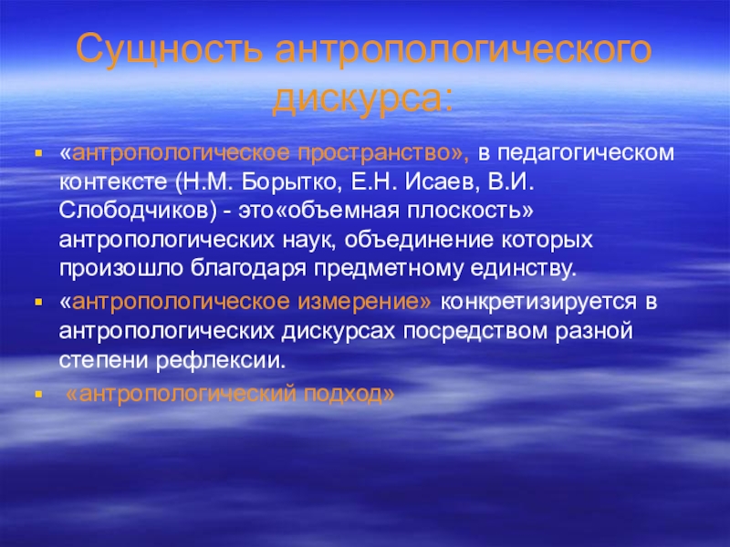 Антропологические дискурсы в педагогике являются одновременно способом понимания реальности в целом и способом понимания педагогической реальности в частности.