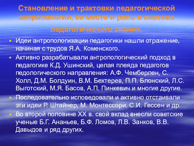 Активно разрабатывали антропологический подход в педагогике К.Д. Ушинский, целая плеяда педагогов педологического направления: А.Ф. Чемберлен, С. Холл, Д.М. Болдуин, В.М. Бехтерев, П.П. Блонский, Л.С. Выготский, М.Я. Басов, А.П. Пинкевич и многие другие.