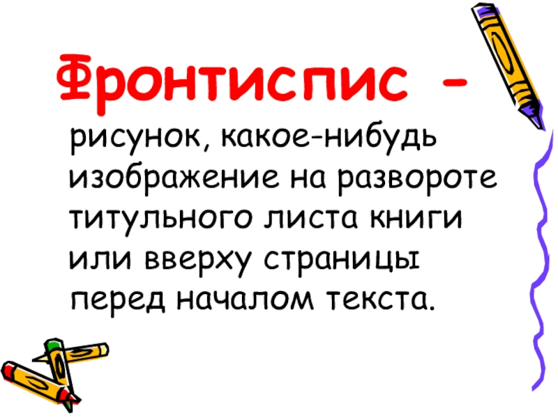 Фронтиспис -  рисунок, какое-нибудь изображение на развороте титульного листа книги или вверху страницы перед началом текста.