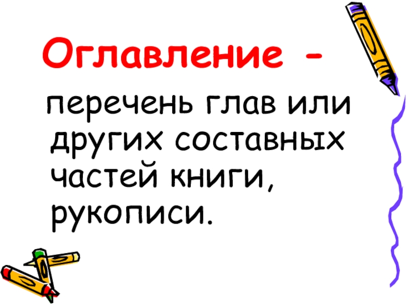 Оглавление - перечень глав или других составных частей книги, рукописи.
