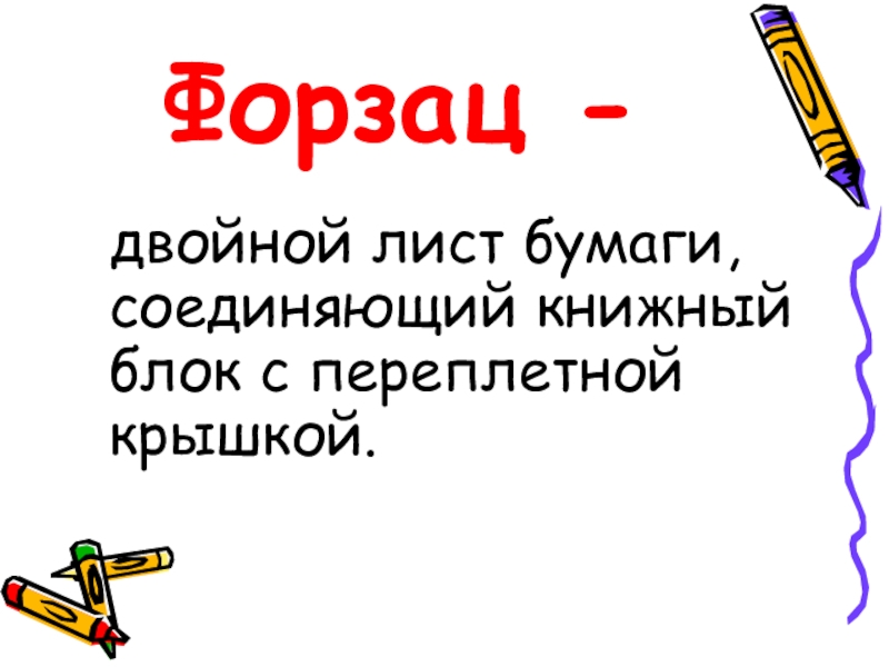 Форзац -  двойной лист бумаги, соединяющий книжный блок с переплетной крышкой.