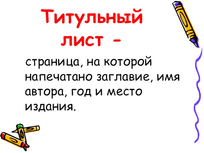 Титульный лист -  страница, на которой напечатано заглавие, имя автора, год и место издания.