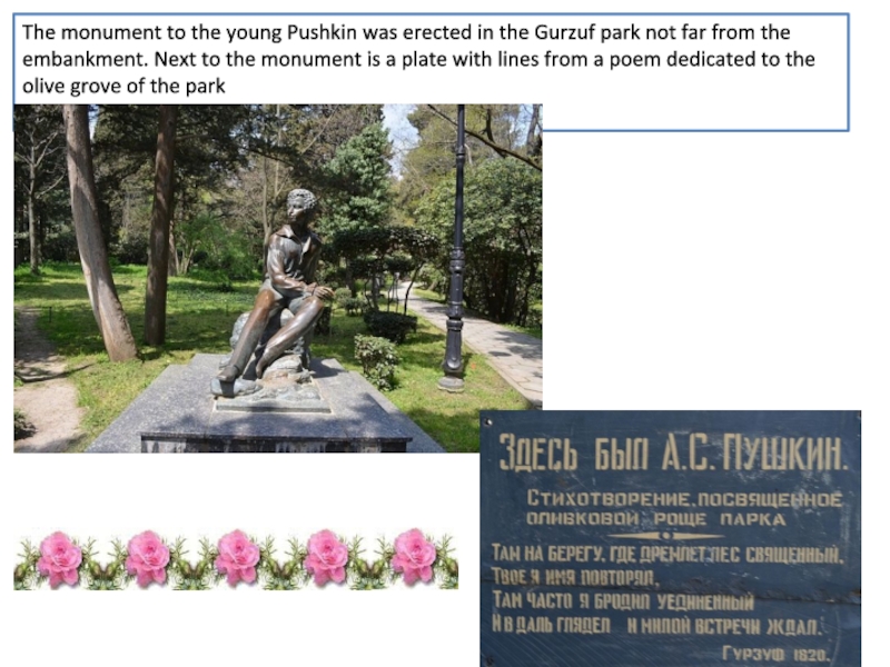 Слайд 15The monument to the young Pushkin was erected in the Gurzuf