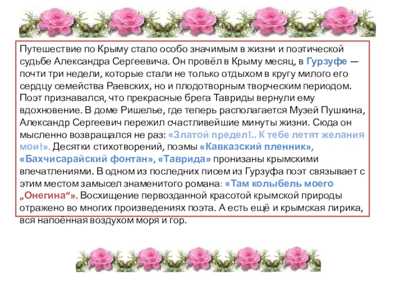 Александра Сергеевича. Он провёл в Крыму месяц, в Гурзуфе — почти три недели, которые стали не только отдыхом в кругу милого его сердцу семейства Раевских, но и плодотворным творческим периодом. Поэт признавался, что прекрасные брега Тавриды вернули ему вдохновение. В доме Ришелье, где теперь располагается Музей Пушкина, Александр Сергеевич пережил счастливейшие минуты жизни. Сюда он мысленно возвращался не раз: «Златой предел!.. К тебе летят желания мои!». Десятки стихотворений, поэмы «Кавказский пленник», «Бахчисарайский фонтан», «Таврида» пронизаны крымскими впечатлениями. В одном из последних писем из Гурзуфа поэт связывает с этим местом замысел знаменитого романа: «Там колыбель моего „Онегина“». Восхищение первозданной красотой крымской природы отражено во многих произведениях поэта. А есть ещё и крымская лирика, вся напоённая воздухом моря и гор.