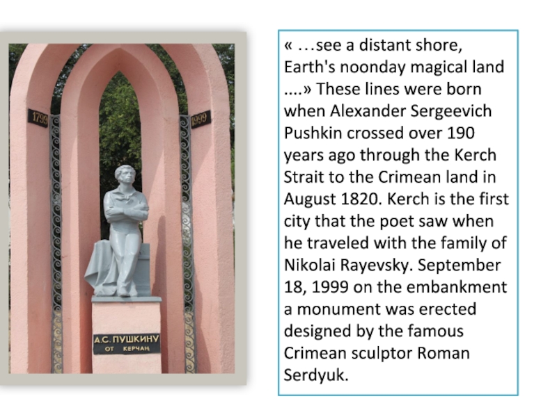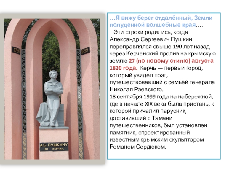 lines were born when Alexander Sergeevich Pushkin crossed over 190 years ago through the Kerch Strait to the Crimean land in August 1820. Kerch is the first city that the poet saw when he traveled with the family of Nikolai Rayevsky. September 18, 1999 on the embankment a monument was erected designed by the famous Crimean sculptor Roman Serdyuk.