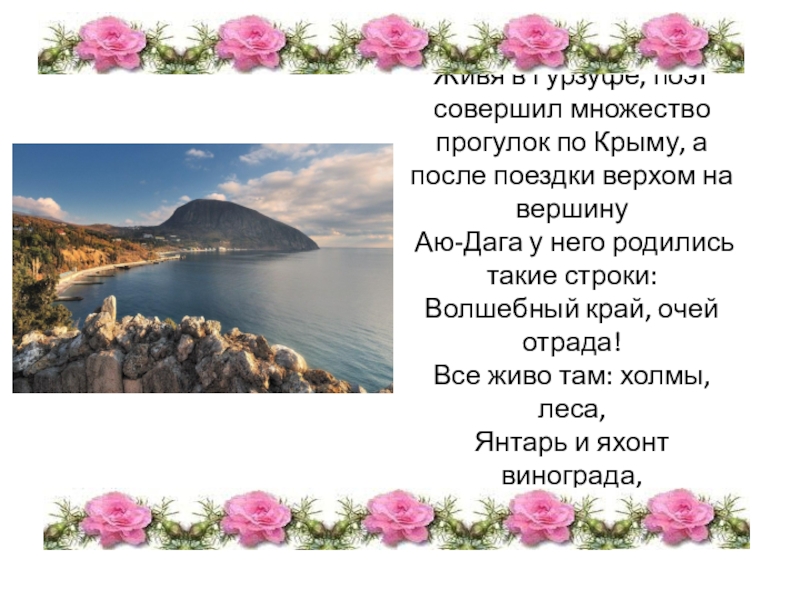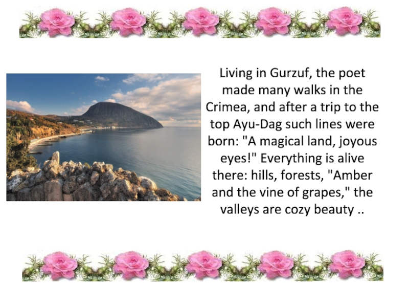 Слайд 16Живя в Гурзуфе, поэт совершил множество прогулок по Крыму, а после