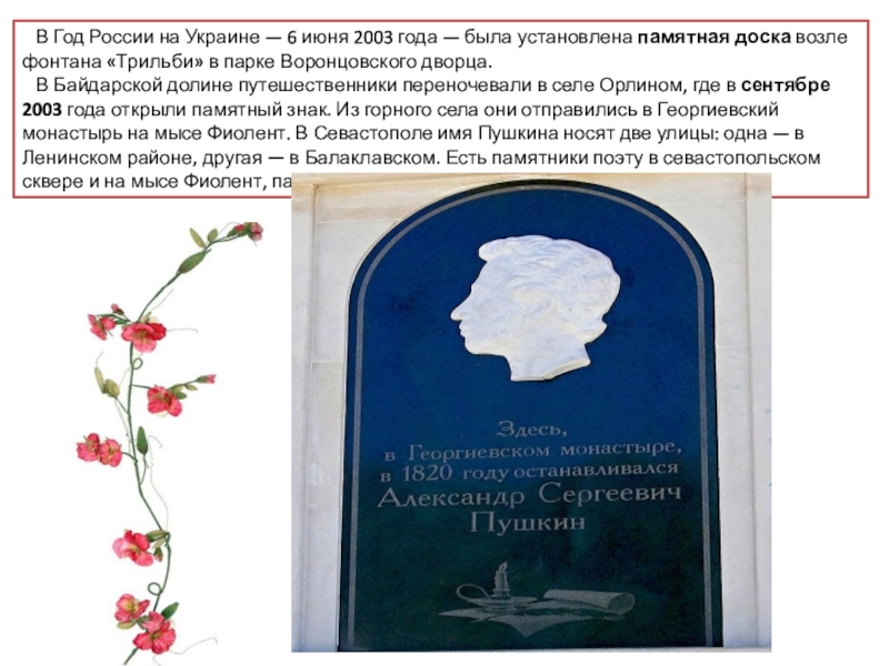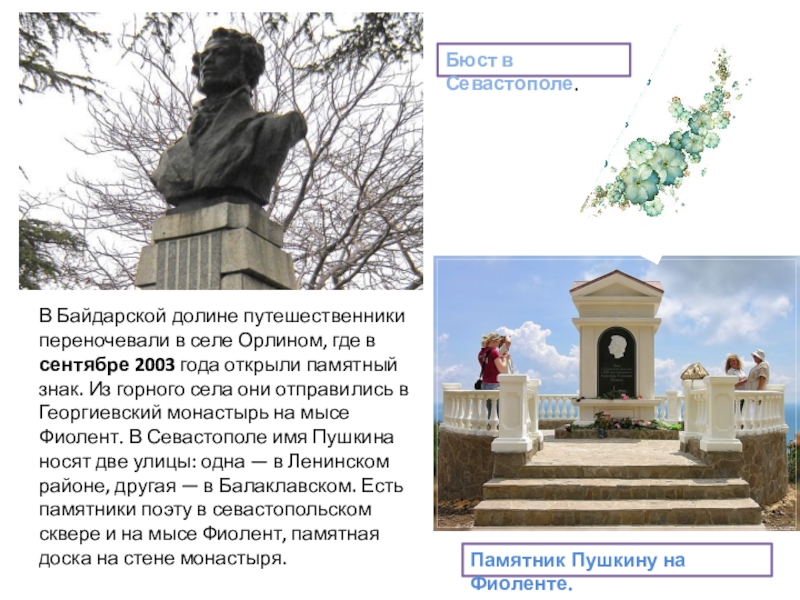 селе Орлином, где в сентябре 2003 года открыли памятный знак. Из горного села они отправились в Георгиевский монастырь на мысе Фиолент. В Севастополе имя Пушкина носят две улицы: одна — в Ленинском районе, другая — в Балаклавском. Есть памятники поэту в севастопольском сквере и на мысе Фиолент, памятная доска на стене монастыря.