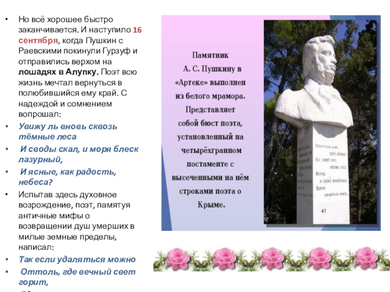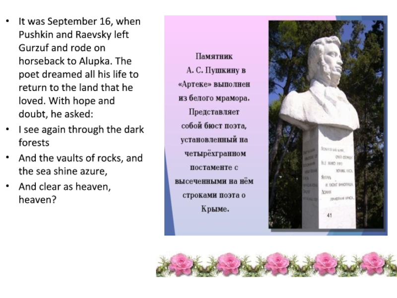Слайд 21It was September 16, when Pushkin and Raevsky left Gurzuf and