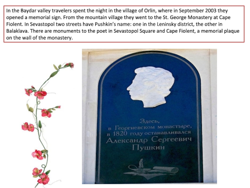 of Orlin, where in September 2003 they opened a memorial sign. From the mountain village they went to the St. George Monastery at Cape Fiolent. In Sevastopol two streets have Pushkin’s name: one in the Leninsky district, the other in Balaklava. There are monuments to the poet in Sevastopol Square and Cape Fiolent, a memorial plaque on the wall of the monastery.