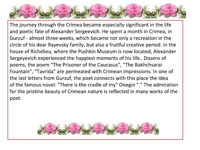 and poetic fate of Alexander Sergeevich. He spent a month in Crimea, in Gurzuf - almost three weeks, which became not only a recreation in the circle of his dear Rayevsky family, but also a fruitful creative period. In the house of Richelieu, where the Pushkin Museum is now located, Alexander Sergeyevich experienced the happiest moments of his life.. Dozens of poems, the poem "The Prisoner of the Caucasus", "The Bakhchsarai Fountain", "Tavrida" are permeated with Crimean impressions. In one of the last letters from Gurzuf, the poet connects with this place the idea of the famous novel: "There is the cradle of my" Onegin "." The admiration for the pristine beauty of Crimean nature is reflected in many works of the poet.