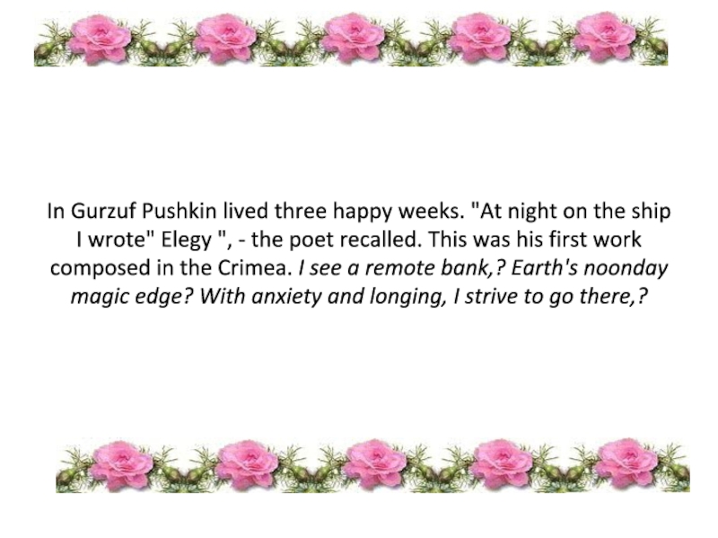 Слайд 13In Gurzuf Pushkin lived three happy weeks. "At night on the