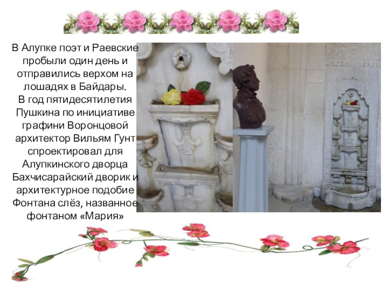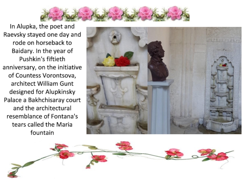 on horseback to Baidary. In the year of Pushkin's fiftieth anniversary, on the initiative of Countess Vorontsova, architect William Gunt designed for Alupkinsky Palace a Bakhchisaray court and the architectural resemblance of Fontana's tears called the Maria fountain
