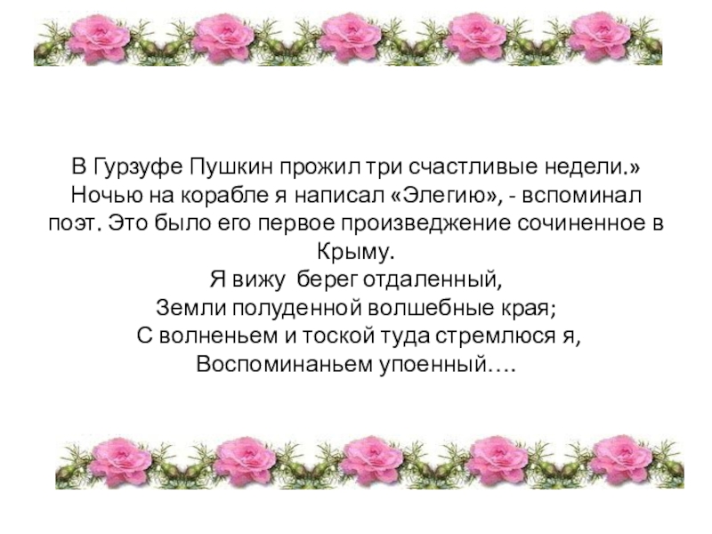 Слайд 12В Гурзуфе Пушкин прожил три счастливые недели.»Ночью на корабле я написал