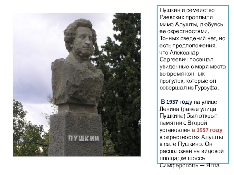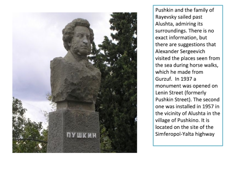 surroundings. There is no exact information, but there are suggestions that Alexander Sergeevich visited the places seen from the sea during horse walks, which he made from Gurzuf. In 1937 a monument was opened on Lenin Street (formerly Pushkin Street). The second one was installed in 1957 in the vicinity of Alushta in the village of Pushkino. It is located on the site of the Simferopol-Yalta highway