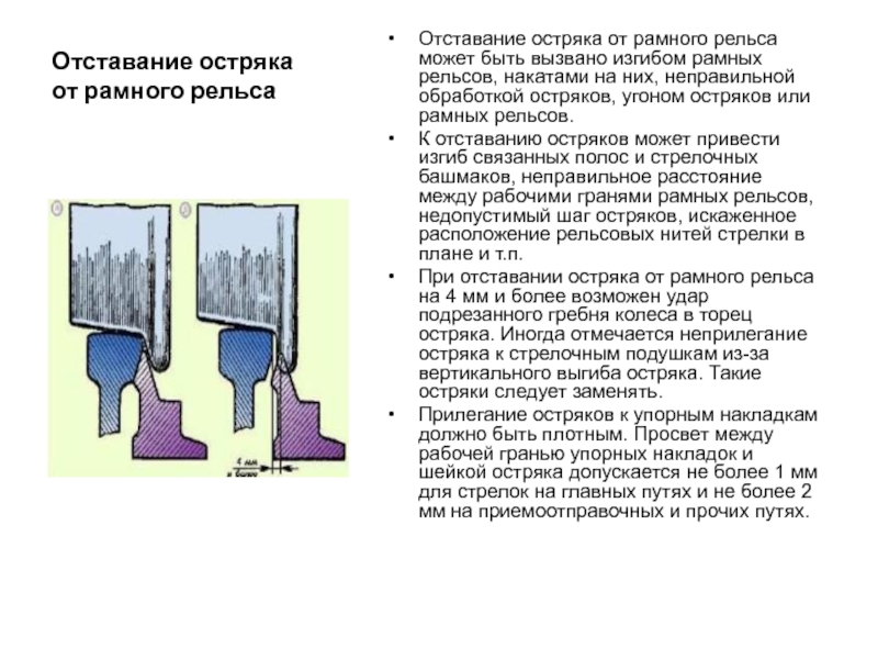 К отставанию остряков может привести изгиб связанных полос и стрелочных башмаков, неправильное расстояние между рабочими гранями рамных рельсов, недопустимый шаг остряков, искаженное расположение рельсовых нитей стрелки в плане и т.п.