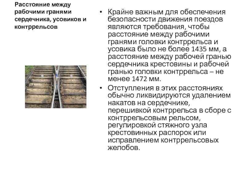 безопасности движения поездов являются требования, чтобы расстояние между рабочими гранями головки контррельса и усовика было не более 1435 мм, а расстояние между рабочей гранью сердечника крестовины и рабочей гранью головки контррельса – не менее 1472 мм.