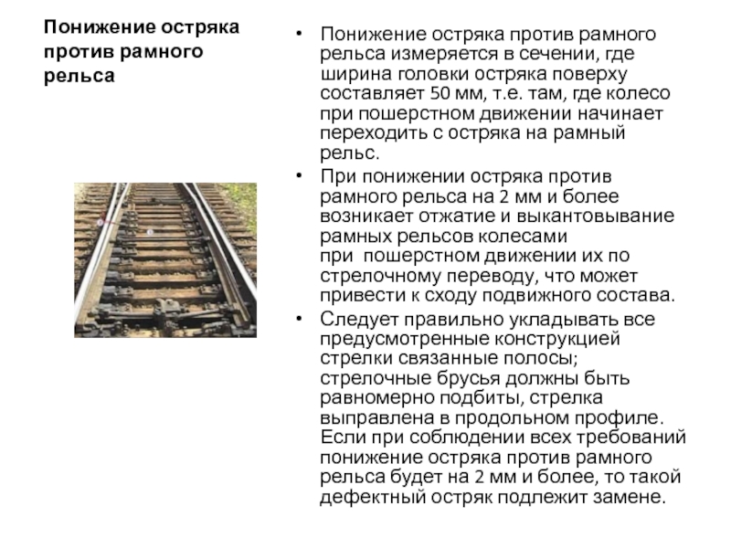 При понижении остряка против рамного рельса на 2 мм и более возникает отжатие и выкантовывание рамных рельсов колесами при пошерстном движении их по стрелочному переводу, что может привести к сходу подвижного состава.