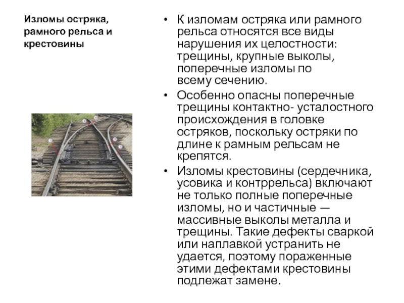Особенно опасны поперечные трещины контактно- усталостного происхождения в головке остряков, поскольку остряки по длине к рамным рельсам не крепятся.