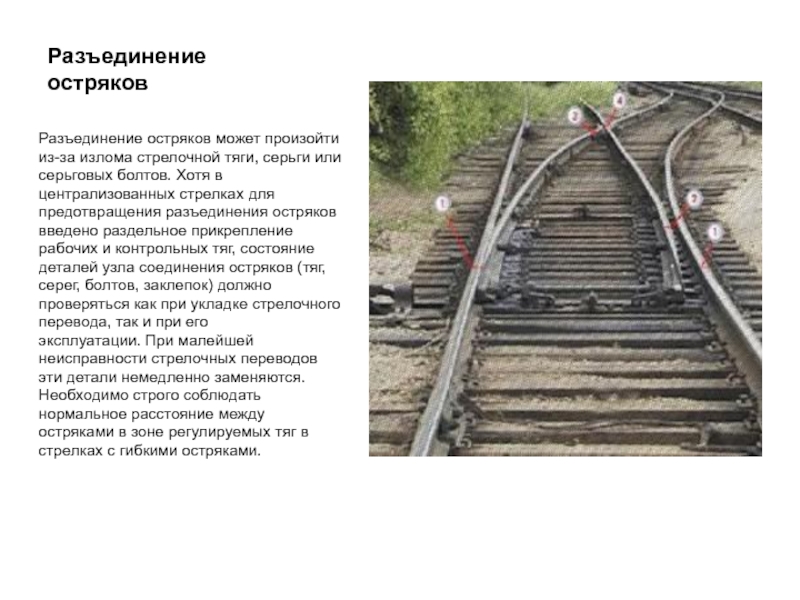 Разъединение остряков может произойти из-за излома стрелочной тяги, серьги или