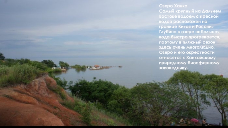 на границе Китая и России. Глубина в озере небольшая, вода быстро прогревается, поэтому в пляжный сезон здесь очень многолюдно. Озеро и его окрестности относятся к Ханкайскому природному биосферному заповеднику.