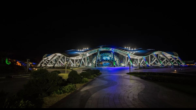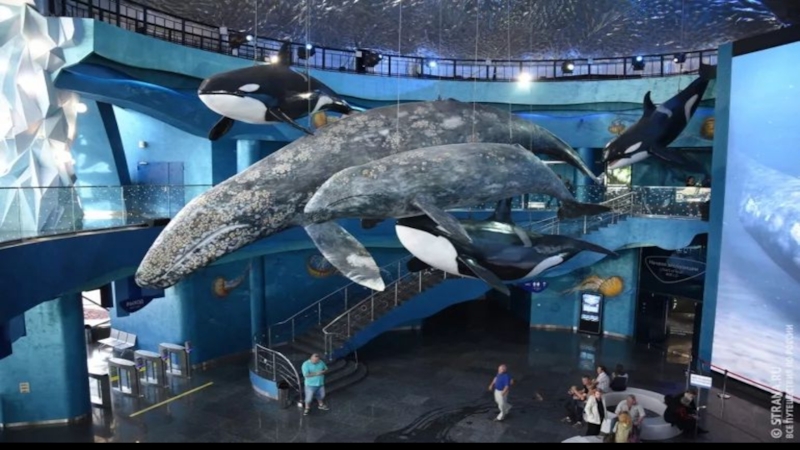 внешним и внутренним дизайном. Его здание выполнено в форме гигантской раковины. Внутренние помещения поражают яркими красками, огромными макетами древних животных, искусственными камнями и льдом, сотней аквариумов с прозрачной водой, современными мультимедийными устройствами. Территория поделена на 9 тематических зон, где представлены обитатели всех океанов мира и пресноводных водоемов.