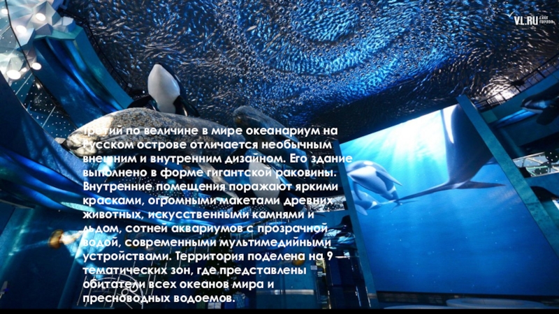Слайд 18Третий по величине в мире океанариум на Русском острове отличается необычным