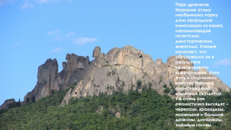 гигантских доисторических животных. Ученые полагают, что образовался он в результате многовекового выветривания. Хотя есть и сторонники неестественного происхождения каменных скульптур. Уж очень они реалистично выглядят – черепахи, крокодилы, маленькие и большие драконы, динозавры, змеиные головы.