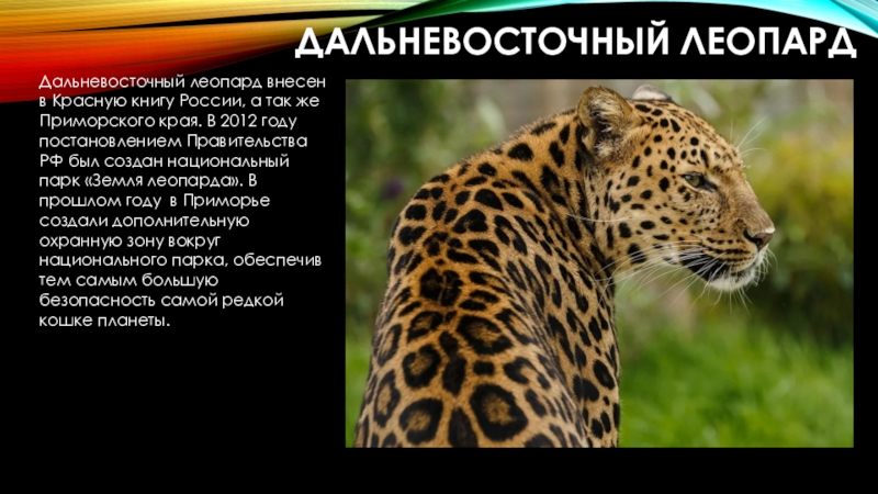 Приморского края. В 2012 году постановлением Правительства РФ был создан национальный парк «Земля леопарда». В прошлом году в Приморье создали дополнительную охранную зону вокруг национального парка, обеспечив тем самым большую безопасность самой редкой кошке планеты.
