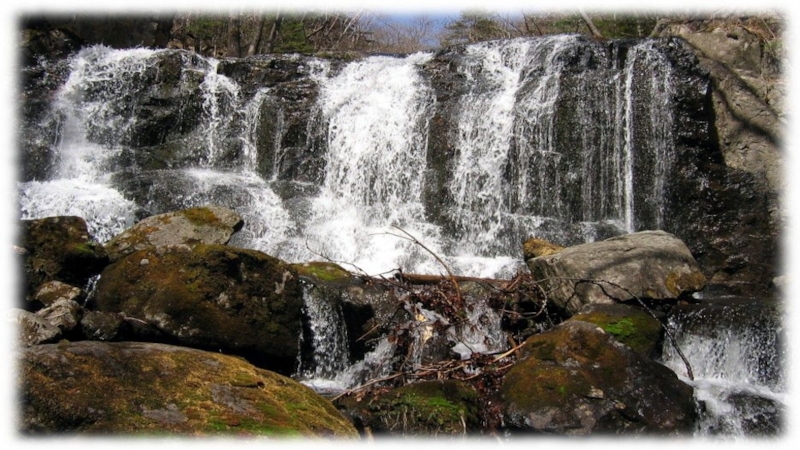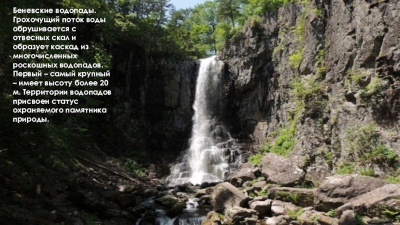 Слайд 27Беневские водопады. Грохочущий поток воды обрушивается с отвесных скал и образует