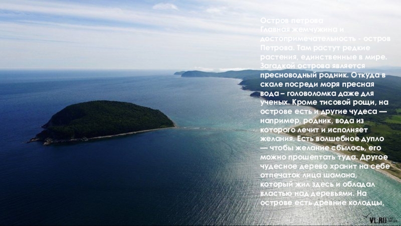 растения, единственные в мире. Загадкой острова является пресноводный родник. Откуда в скале посреди моря пресная вода – головоломка даже для ученых. Кроме тисовой рощи, на острове есть и другие чудеса — например, родник, вода из которого лечит и исполняет желания. Есть волшебное дупло — чтобы желание сбылось, его можно прошептать туда. Другое чудесное дерево хранит на себе отпечаток лица шамана, который жил здесь и обладал властью над деревьями. На острове есть древние колодцы,