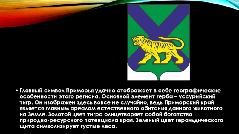 Основной элемент герба – уссурийский тигр. Он изображен здесь вовсе не случайно, ведь Приморский край является главным ареалом естественного обитания данного животного на Земле. Золотой цвет тигра олицетворяет собой богатство природно-ресурсного потенциала края. Зеленый цвет геральдического щита символизирует густые леса.