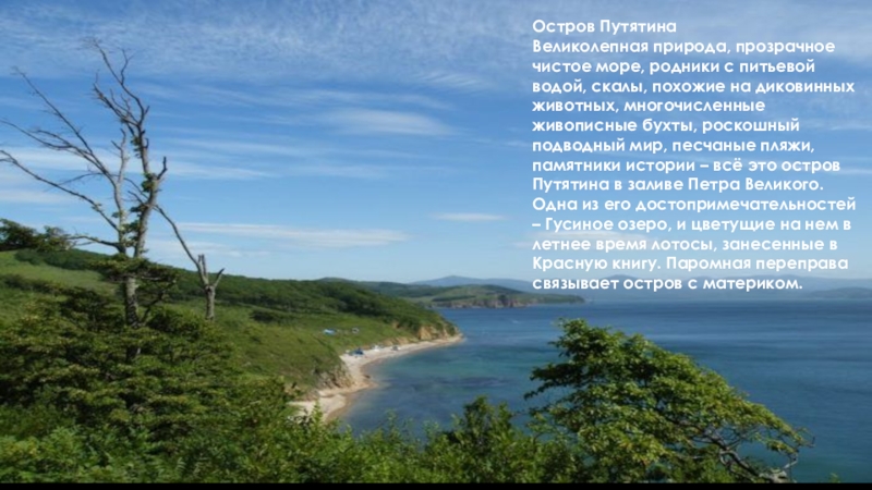 похожие на диковинных животных, многочисленные живописные бухты, роскошный подводный мир, песчаные пляжи, памятники истории – всё это остров Путятина в заливе Петра Великого. Одна из его достопримечательностей – Гусиное озеро, и цветущие на нем в летнее время лотосы, занесенные в Красную книгу. Паромная переправа связывает остров с материком.